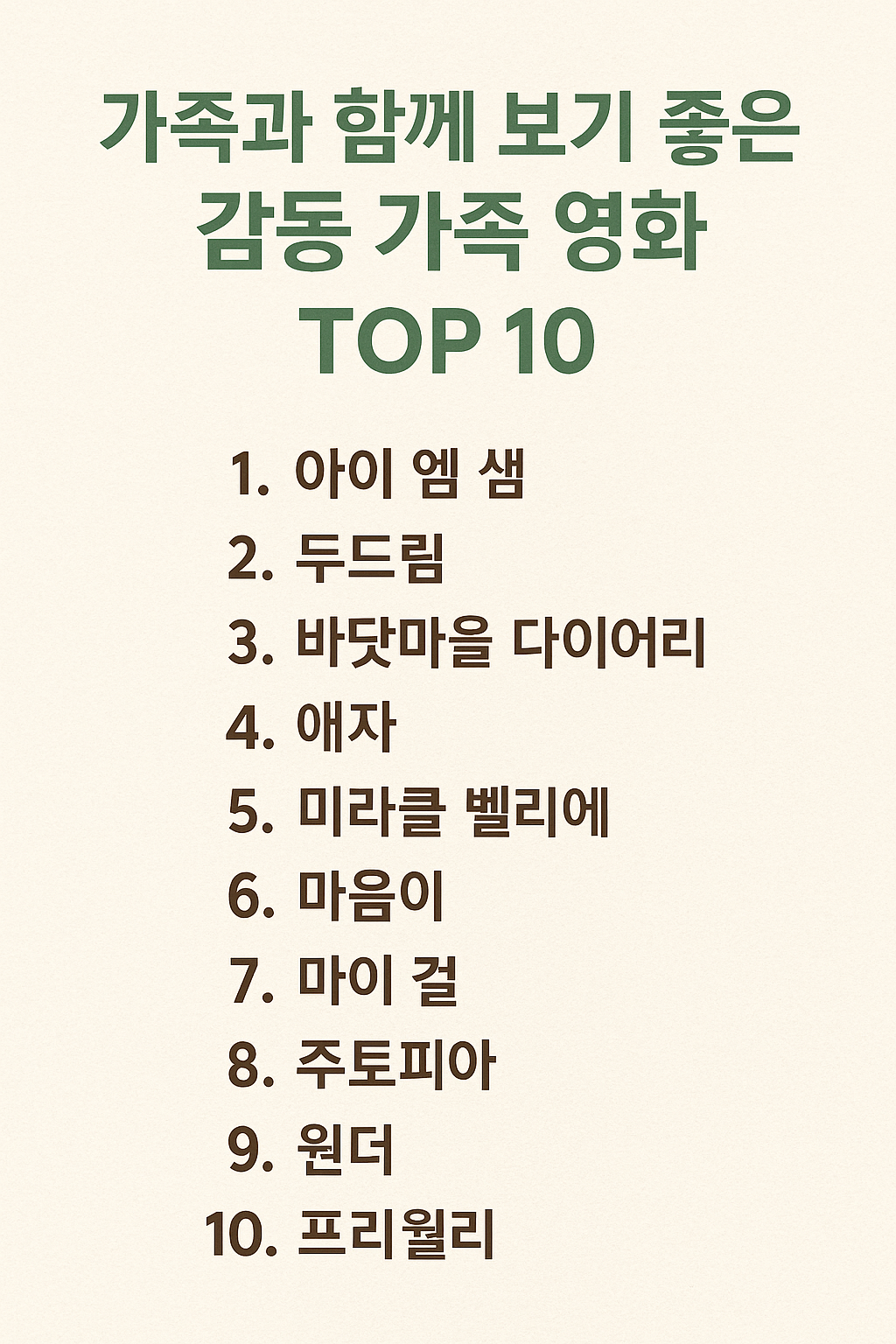 가족과 함께 보내는 시간은 어떤 활동보다 소중합니다. 특히 영화를 매개로 함께 웃고, 울고, 공감하는 경험은 서로의 관계를 더욱 깊이 있게 만들어 줍니다. 오늘 소개한 TOP 10 감동 가족 영화는 단순한 재미를 넘어, 삶에 대한 통찰과 따뜻한 메시지를 전합니다. 짧은 시간 속에서도 오래도록 남을 기억을 만들고 싶다면, 이 리스트에서 한 편 골라 가족과 함께 감상해보세요. 그리고 그 감동을 오래도록 간직하시길 바랍니다.